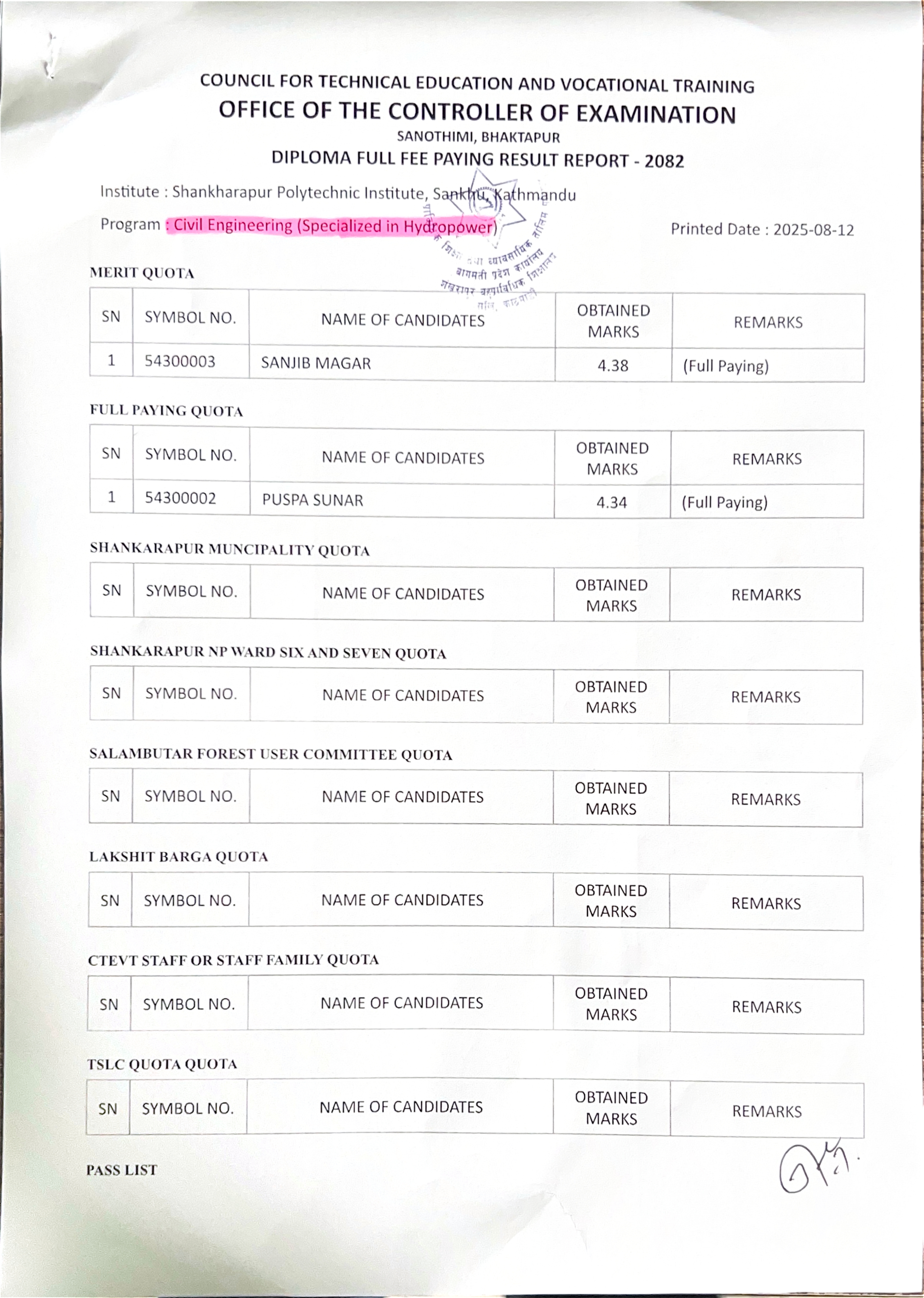 Result- Civil Engineering (Specialized in Hydropower) 2082